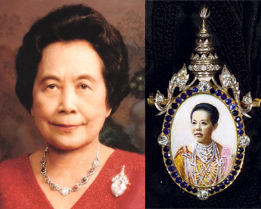 The necklace is decorated with nine gems, a lucky charm for the Siamese. The princess is also wearing a brooch with an enamel of her grandmother, Queen Sri Bajarindra, decorated with diamonds and sapphires. |