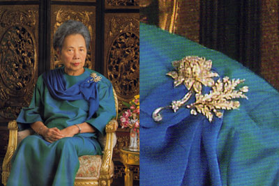 The Princess is wearing the diamond belt-head as a brooch in this photo. Her diamond bracelet is shown at left. At top right is a pair of large diamond bracelets, and below them is a diamond brooch, with a large stone at the centre. It is a rare event to see the Royal Jewels on display, but on her 80th birthday celebration, the jewels were brought out and displayed at her villa for the well-wishers to see. Below is another diamond brooch. | |