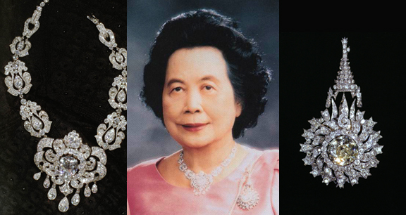 Princess Bejaratana's jewellery collection includes this diamond necklace and a brooch with a Thai crown on top, and one large stone in the centre.