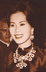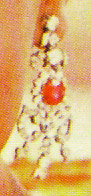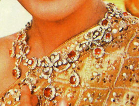 This magnificent ruby suite comprises a necklace and a pair of chandelier earrings. The necklace could have belonged to Queen Sri Bajarindra, as she had a similarly designed piece with sapphires. The earrings would be new, as Queen Sri Bajarindra did not wear earrings. |