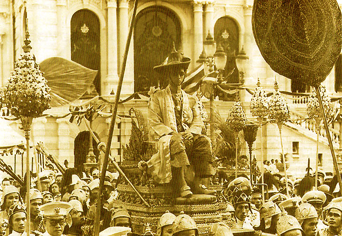 | At the Coronation Ceremony, His Majesty the King is seen wearing the full regalia of the Kingdom of Siam. | His Majesty the King being carried on a Royal Palanquin outside the Chakri Maha Prasat Throne Hall during the Coronation Ceremony. |