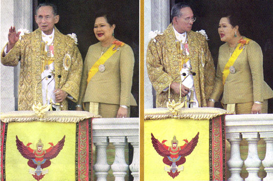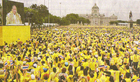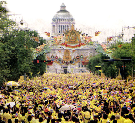 Today has been a very emotional day for the Thai people. I have to say that millions, yes MILLIONS of people gathered at the Royal Plaza outside the Anatasamakom Throne Hall to catch a glimpse of their King. Some camped out overnight just to be sure to get the best possible spot. It is the first time that you get to see people as far as the eyes could see. You cannot see Rajadamnern Road anymore, just people wearing yellow shirts, for the King's official colour is yellow. When the King finished his speech, people just kept chanting "Long Live the King, Long Live the King, Long Live the King." The chant just kept on going and got louder and louder, it became very emotional. People started to cry. The King and Queen just kept looking and waving from the balcany. I believe Their Majesties were overwhelmed as well. It took a long while before Their Majesties went back inside the palace. The extra time they spent on the balcony was just special. It showed. |