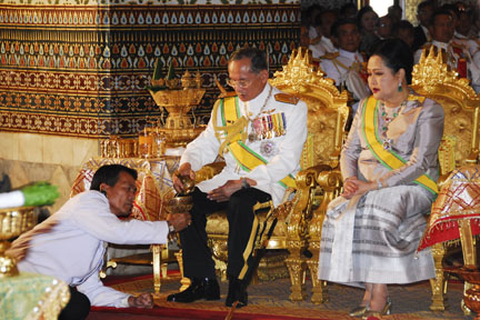 Their Majesties the King and Queen and members of the Royal Family again presided over official ceremonies at the Amarindra Vinitchai Throne Hall in the Grand Palace. It was a long one, almost two hours long, as it included both a Buddhist Ceremony and a Brahmin one. First, the ceremony included the raising of ranks for 69 Buddhist monks, a normal thing for a very special occasion. Then there was a blessing ceremony for the Royal Regalia, which is very rare to see. The Brahmin Ceremony is a very ancient one, including the circling of candles by members of the Royal Family, the Privy Council and high ranking government officials. I believe that Thailand is the only country in the world where we incorporate both Buddhist traditions with Brahmin ceremonies. I am happy to see that this is still practiced in the Kingdom and continues to be so for a long time to come, as since the end of absolute monarchy in 1932, the then government has cut down over fifty percent of the traditional Court Ceremonies. I believe that these ceremonies together is the core of our ancient culture. |