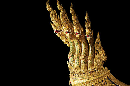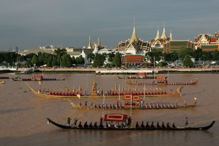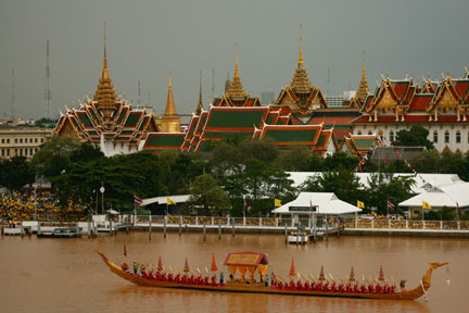 The Royal Barge Procession in the early evening was a proper show of the ancient Thai culture. I believe that it is the first time for nearly all the Royals attending to see the Royal Barges, with the exception of the Sultan of Brunei who witnessed a show during the APEC meeting a few years back. The "show" nevertheless was a bit strange for me. I have witnessed the actual use of the Barges by His Majesty the King on one occasion for real - the 200 years celebration of Bangkok back in 1982, and one occasion on television - the Golden Jubilee of His Majesty the King in 1996. So, I always associate the use of the Royal Barges as something special, and not just a "Light and Sound Show." The first time these barges came on show was at the APEC meeting during this goverment's first term. Many Thai people travelled from all parts of the country to witness this event, and from the live television interviews, many believed that the event would be the same as the one performed by His Majesty at the Bangkok 200 years celebration and his Golden Jubilee, where His Majesty actually travels in on of the principle barges. The general public still see the Royal Barges Procession as something proper that should be highly respected and not just for show as the government seems to see it to be. Nevertheless, the barges are still a sight to be seen. People still get goosebumps from hearing the sound of the chanting. The procession was followed by a visit to an exhibition about His Majesty the King's work, which was a bit surreal, and I don't know if the visiting Royals got the whole picture. I just hope that they did, and are as proud as we are about our King's doings of the past 60 years. |