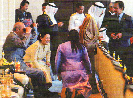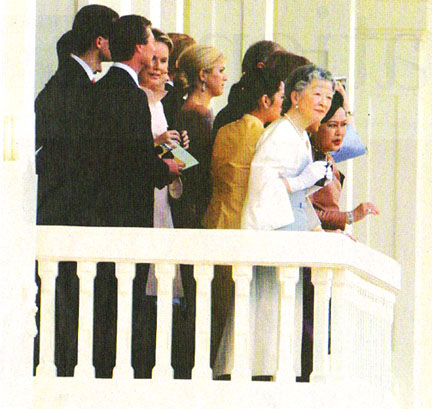 | Left: HM the Queen is seen explaining about the Royal Barge Procession to the Empress of Japan. Also in the photo is Princess Maxima of the Netherlands, Princess Mathilde of Belgium and Grand Duke Henri of Luxembourg. Above: The Crown Prince of Tonga and the Prince of Oman are both keen to see the details of the barges using binoculars, while Princess Maha Chakri Sirindhorn is chatting with Princess Siribha. | ||||